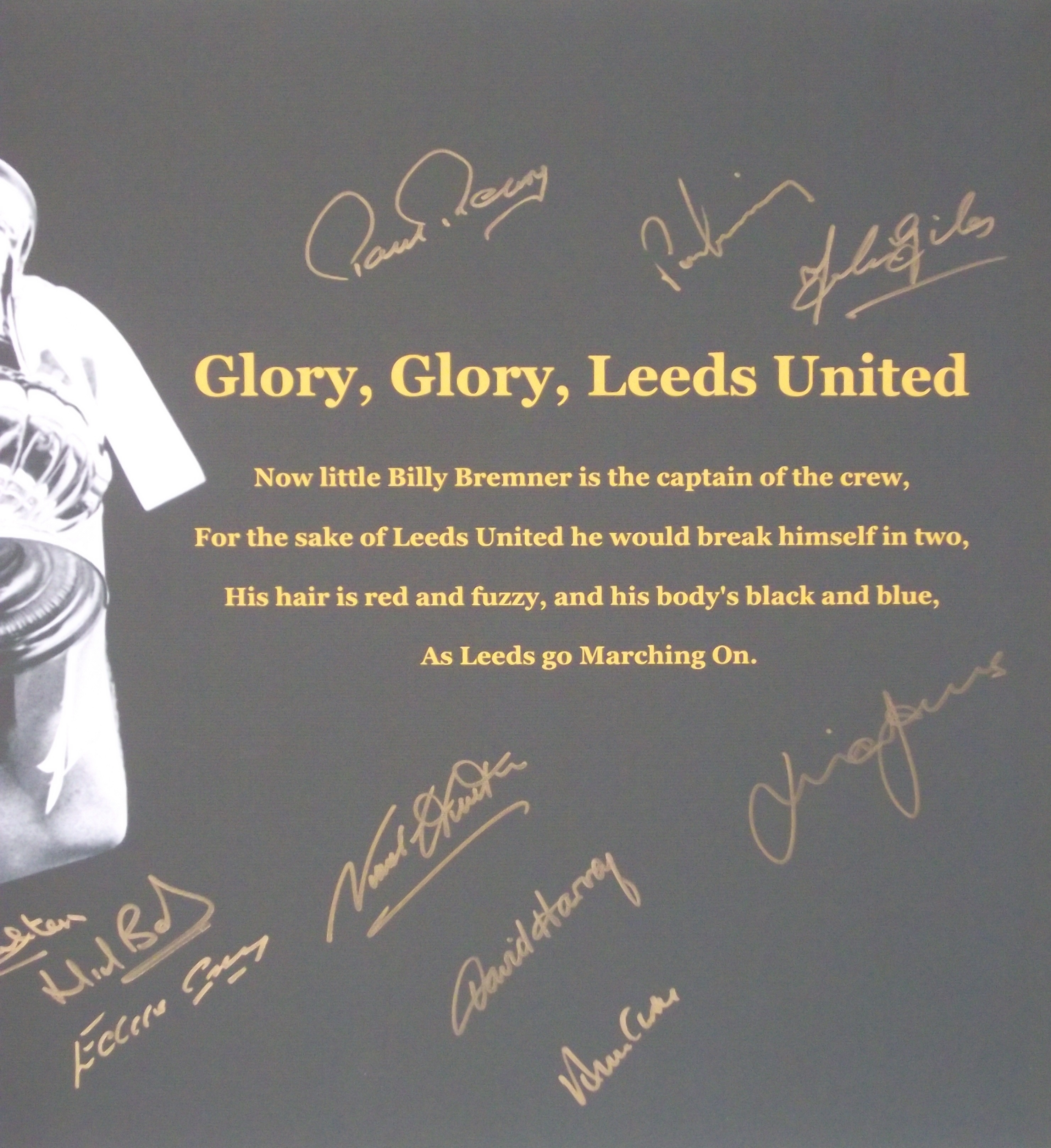 Leeds United 1972 FA Cup Winners autographed canvas featuring the iconic image of Billy Bremner lifting the cup after beating Arsenal 1-0 at Wembley along with a line from the song Glory Glory Leeds United, signed by 10 players in gold sharpie to match the text.