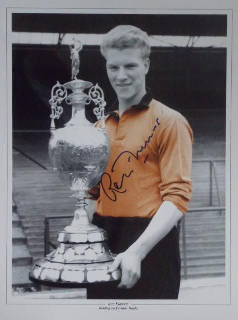 Ron Flowers - Wolverhampton Wanderers Legend, signed 16" x 12" Photograph in black Sharpie, shows iconic image of Ron holding the old 1st division trophy back in 1953-54 season.