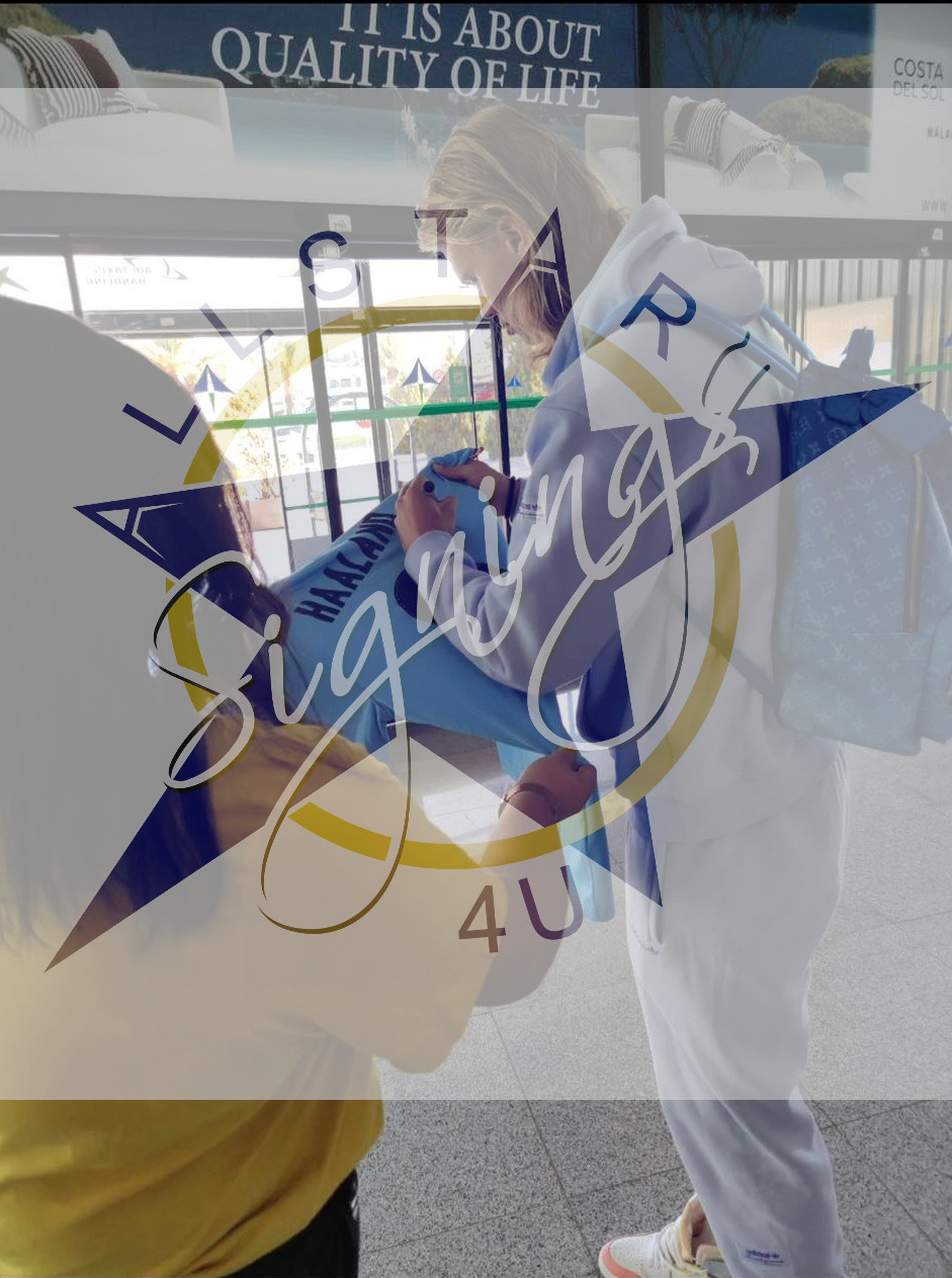Comes complete with our company COA which features an image of Erling signing these shirts in Malaga airport November 2022. Managed to capture him on more than one occasion with a few shirts signed, as he had his Man City medical, warm weather training and injury treatment in Spain. Also have video evidence to back up the authenticity which wil be sent to buyers.