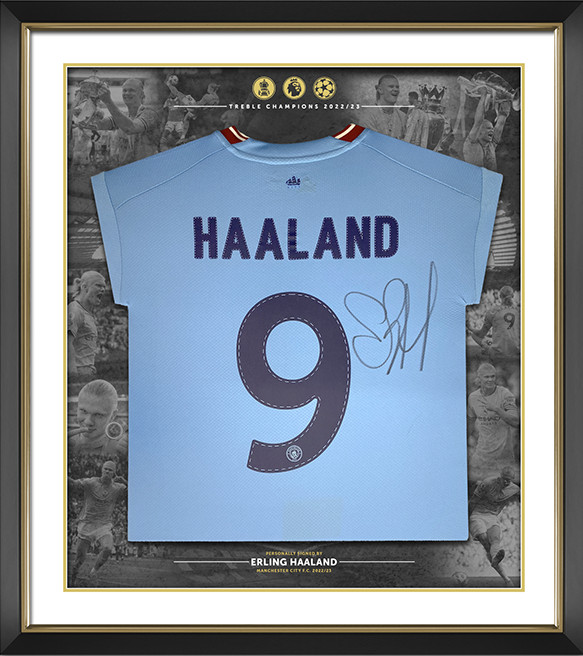Erling Haaland Signed & Framed 2022-23 Season Premier League Shirt, beautifully presented with images of Erling throughout this momentous campaign including images of him holding all three trophies in celebration of victory.