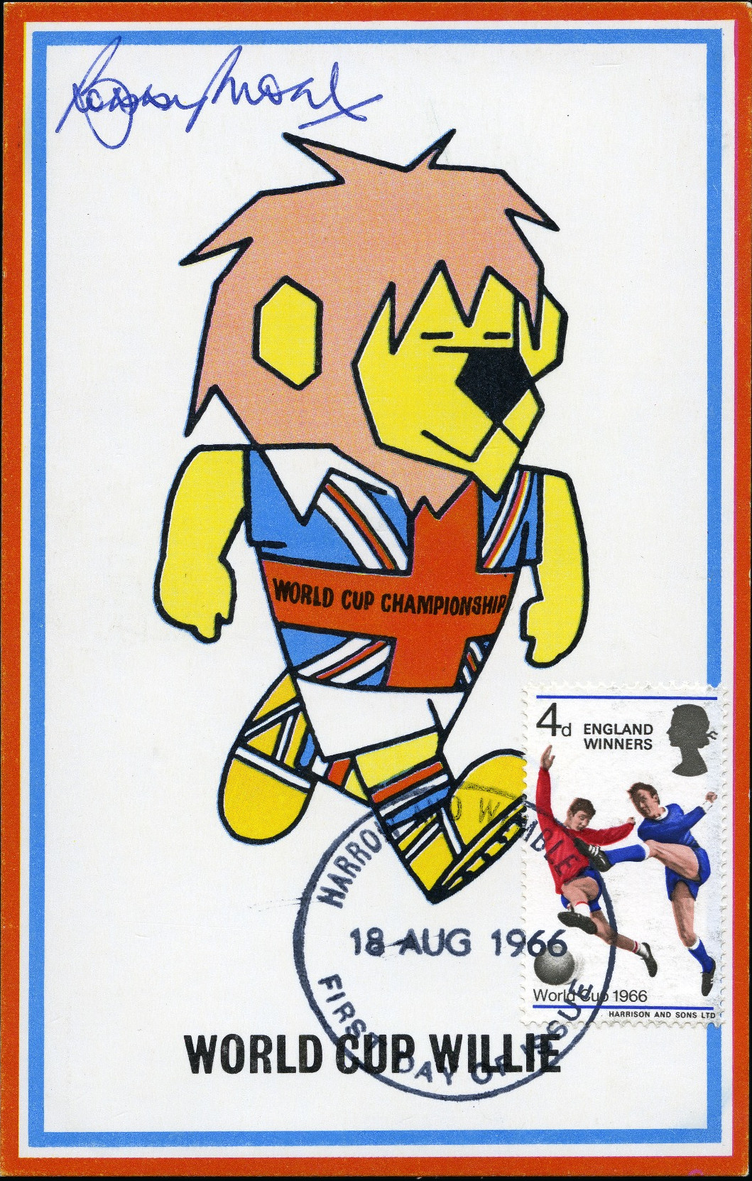 NEAR MINT condition original Cameo Stamps 1966 World Cup Willie FDC cover with the Harrow & Wembley 18 AUG 1966 franking on the stamp which has been hand signed by England's winning captain Bobby Moore. Nice bold signature in blue biro towards top of cover, extremely RARE as Bobby it would appear didn't sign that many as they very rarely come up for sale on the open market. As you can see from the images apart from Bobby's autograph there is no writing on the card plus it's free of creases.......rate this cover condition as 9.9 / 10 Comes complete with our company COA.