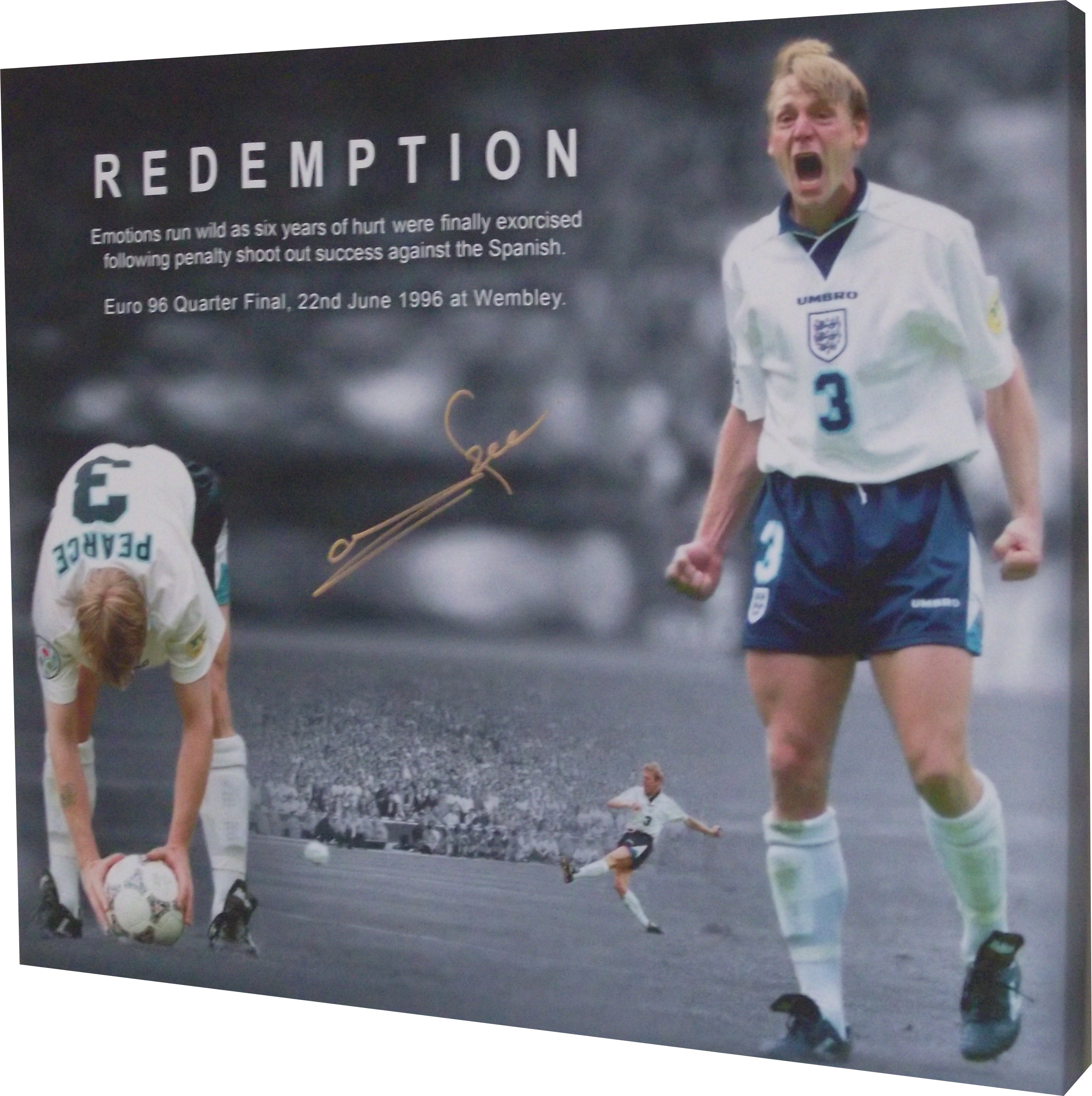 Stuart Pearce Euro 96 "Redemption" signed Colourised Canvas, Stuart signed a very limited qty of these for us on Saturday 17th May. The images on this canvas are fully licensed and show the stages of placing ball on the spot, taking and scoring then the ultimate roar of ecstacy. Canvas measures 24" x 20" x 1.5" Comes complete with our company COA which incorporates photo proof of Psycho signing.