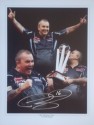 Phil signed a limited qty of these for us in SILVER SHARPIE. Montage made up of three Officially Licensed images including Phil with the Embassy World Darts Champion trophy after winning it for the 16th time. Phil "The Power" Taylor is the best supported and most successful Darts player of all time, bettering the record of the "Crafty Cockney" Eric Bristow. Montage measures 16" x 12" Item comes complete with our company COA which incorporates the image of Phil at our private signing with him on 25th September 2015 in Bradford before a sporting dinner.