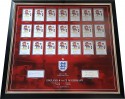 England 1966 World Cup Winners set of Willie cards signed by 21 players from that victorious squad that defeated West Germany 4 v 2 (aet) at Wembley back on Saturday 30th July 1966. Added to this are two autographed pages signed by the captain Bobby Moore, making the full 22 man tournament squad plus manager Sir Alf Ramsey, all set within acid free mountboard that has images from the final plus text dry mounted and overlaid. Text includes Kenneth Wolstenhome's famous quote to the top with Final stats below 3 Lions crest. Stunning, Stylish display representing England's greatest footballing achievement !! Frame measures 33" x 28" Jules Rimet cards Hand Signed by:-